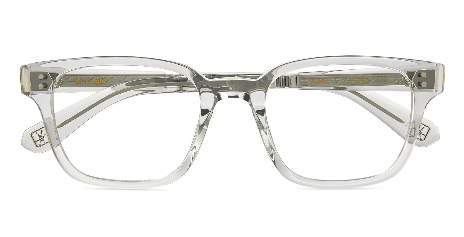 Surveyor C is a large, rectangular acetate frame with a bold bridge and endpieces. Classic and retro, this ultra masculine design combines strong lines with timeless style and includes a saddle bridge with Cartography core wire filigree and tripe hex plaques.